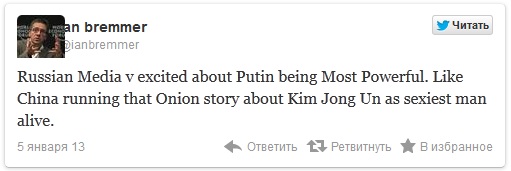 История с якобы признанием Путина самым влиятельным политиком мира ожидаемо превратилась в фарс, когда стало ясно, что это был не рейтинг интернет-журнала Foreign Policy, а опрос, который Ян Бреммер, президент консалтинговой компании Eurasia Group, провел у себя внутри компании, о чем и написал в своем блоге в этом журнале. Его пост начинается словами: "Несколько дней назад я сделал небольшой, неформальный обзор в Eurasia Group на тему власти и глобальной политики. Вопрос: Кто самые влиятельные люди в мире?".