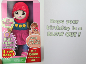 Мусульмане Соединенных Штатов возмущены появлением в продаже поздравительной открытки, на которой изображена кукла в мусульманской одежде с надписями, в которых ее ассоциируют с терроризмом.