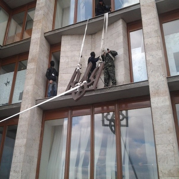 13:30 В соцсетях появилось фото, как со здания Донецкой ОГА снимают герб Украины.