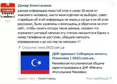 «Сегодня общался с имамом из Макеевки Дамиром Ахметжановым, которого городской сайт Макеевки назвал муфтием ДНР. Как я и думал, Дамир-хазрат не давал согласия на этот пост, и вообще не знал об этом. Я ему верю, так как знаю его хорошим мусульманином и достойным имамом. Поэтому вчера просил не спешить с осуждениями», - написал муфтий.