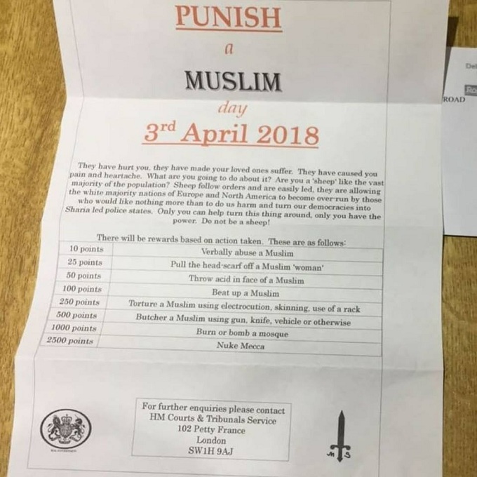 В нескольких городах Великобритании неизвестные лица распространили брошюры с призывами присоединиться к «дню наказания мусульман», который назначен на 3 апреля. Об этом сообщает The Guardian. По информации издания, эти брошюры распространялись 10 и 11 марта.